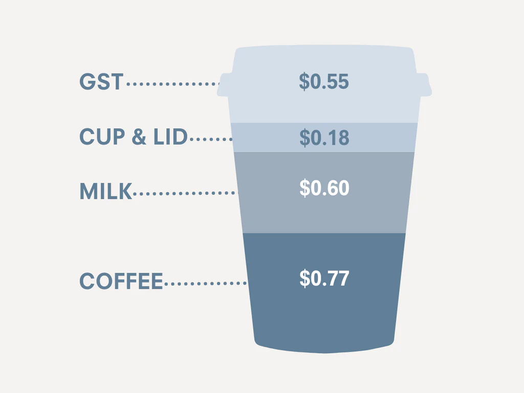 In Australia, the average component costs for a 12oz takeaway Flat White typically comes in at around $1.55 per cup (or around $2.10 per cup if we include GST).
